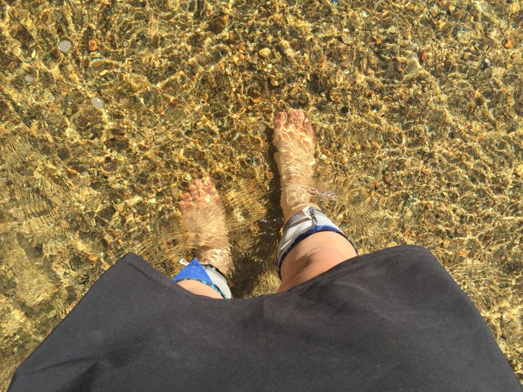 The trail goes across a wide shallow stream. Jeff walks right through with his shoes on. The Swiss hiker, Jonathan and I stop to peal our socks off. We wade across. The water feels so good on my feet! I get to the other side and put my dirty socks back on.