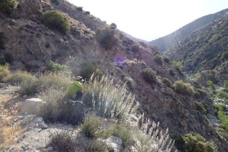 The meadow gives way to rocks and bushes. I pass the sister team taking a break sheltered from the wind. Jeff is far ahead. Or is he… I’m wary of each tall grass patch I pass.
