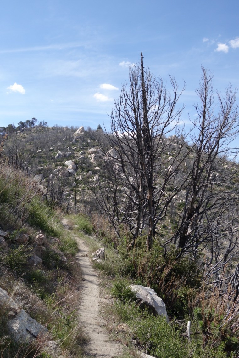 We enter a dry burn section. Signs warn us of unstable trees.