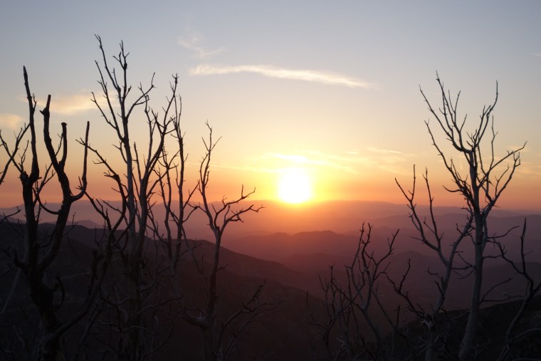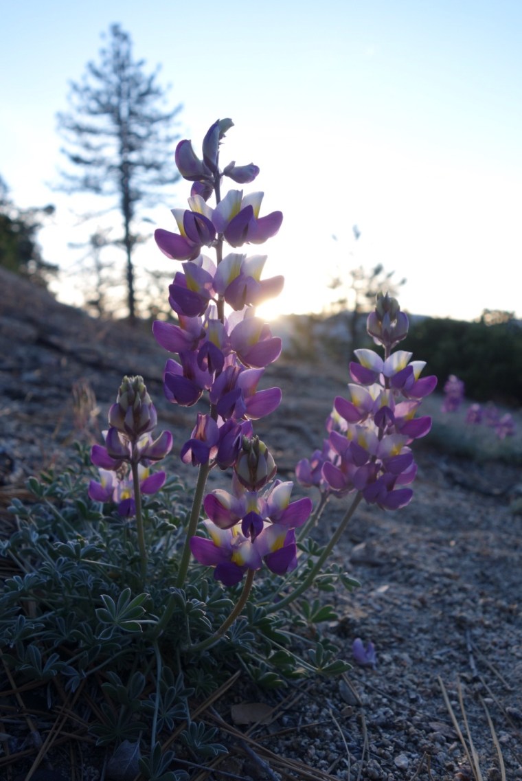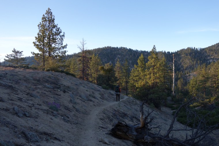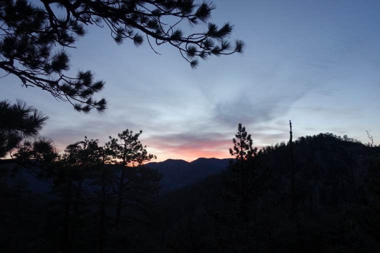 The trail leads us down a hill through tall pine trees. The sun starts to rise and highlights their branches with gold. It’s beautiful.