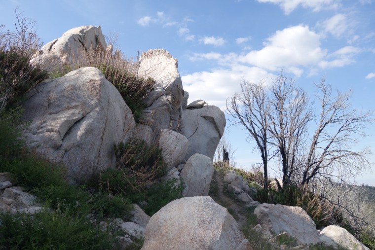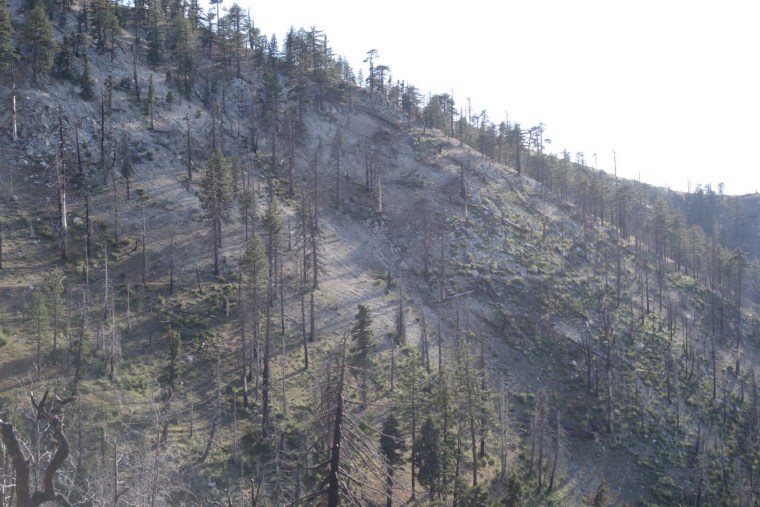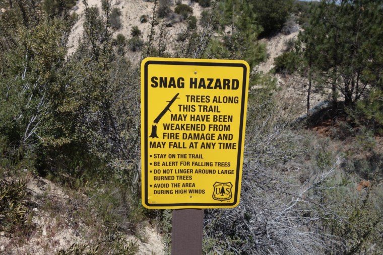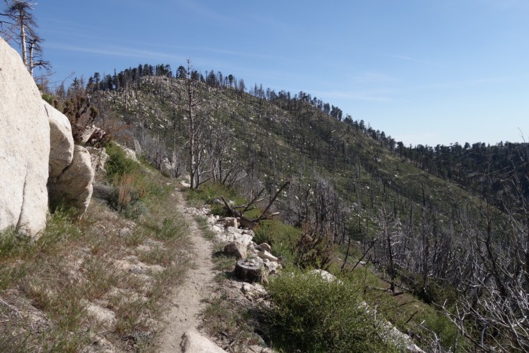 We enter a dry burn section. Signs warn us of unstable trees.