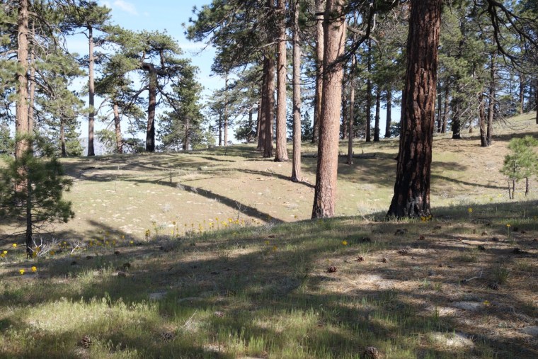 I push on with another hiker called Cappie. The other side of the hill is covered in grass and yellow flowers. Tall pine trees shade the way. It feels so nice.