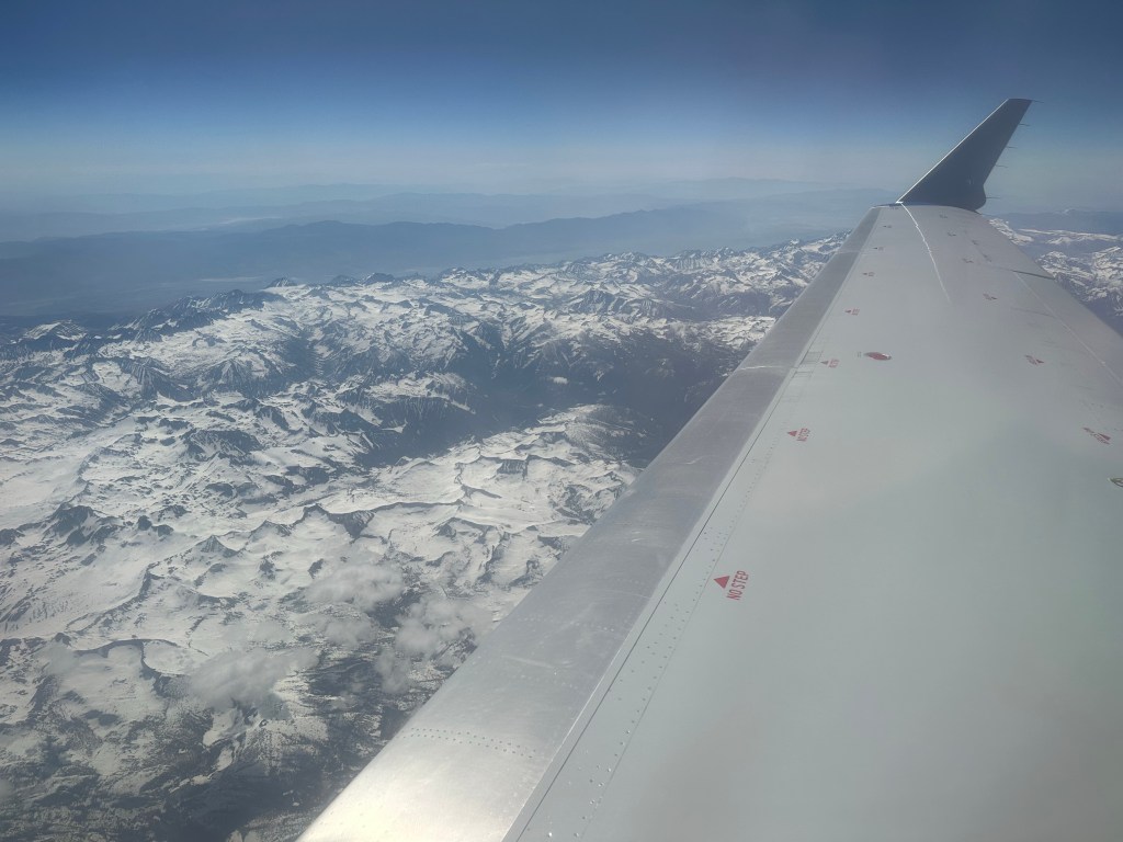 The flight went by quickly. There is still so much snow in the sierras! I can imagine what hiking through there must be like: lots of postholing! (where you take a step on a snowy surface and sink down, sometimes up to your waist!)