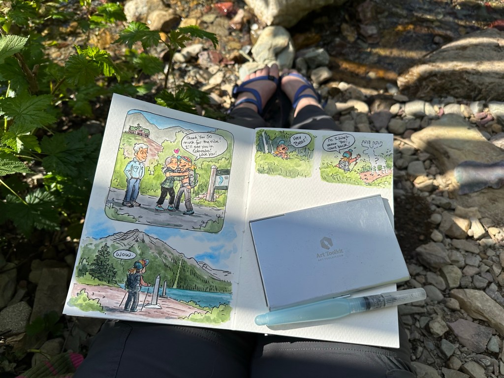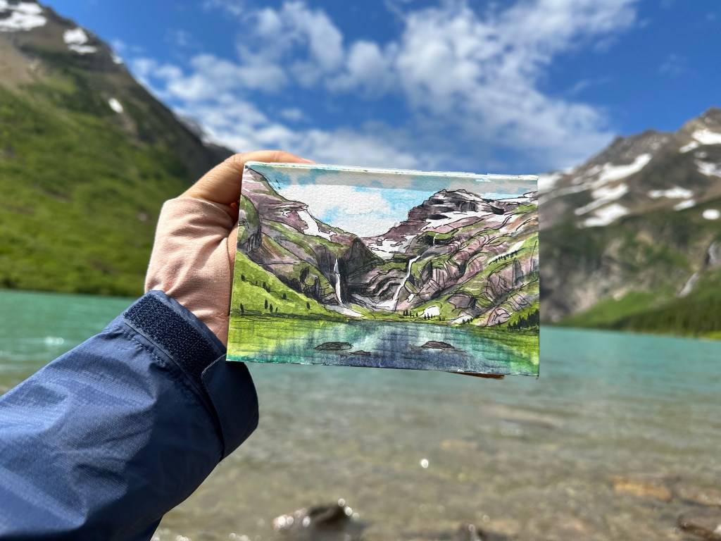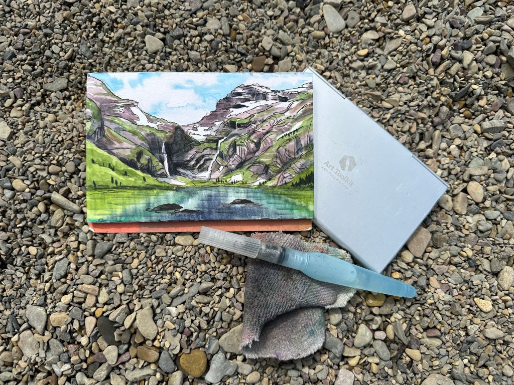They depart and I take some time to paint by the lake. The sun comes out illuminating the waters a magical turquoise blue.