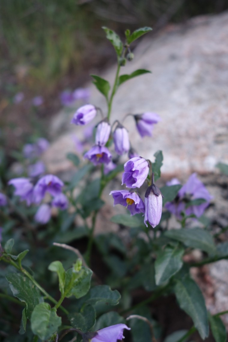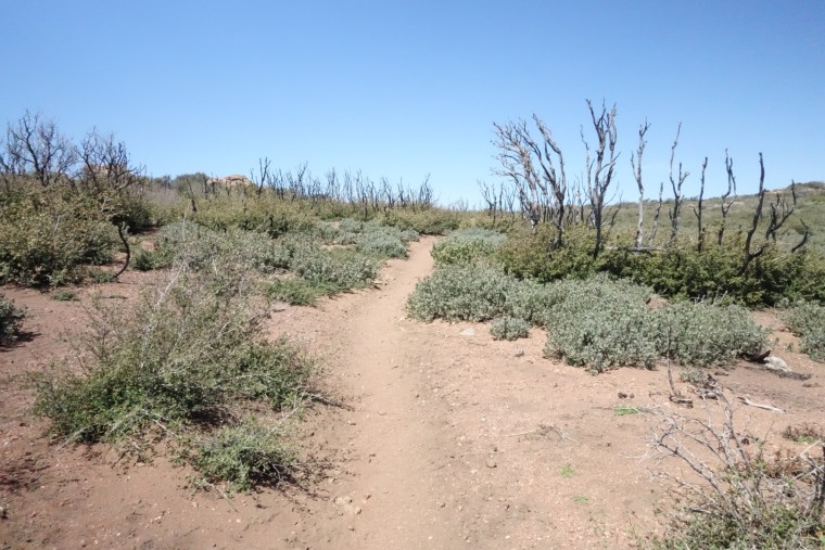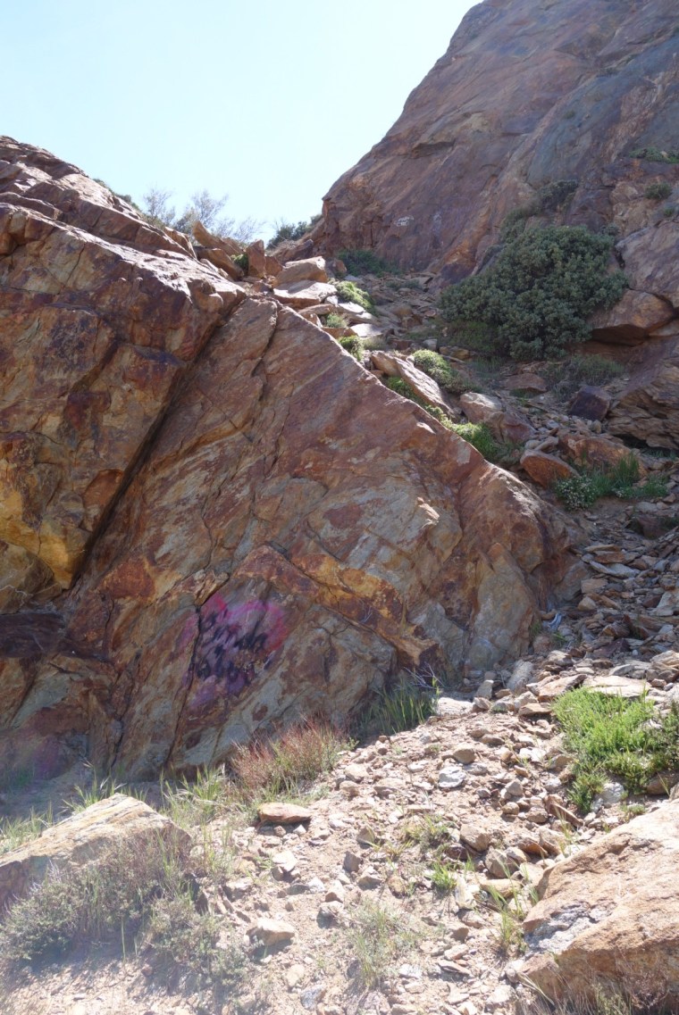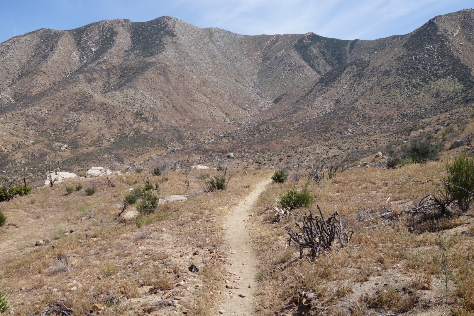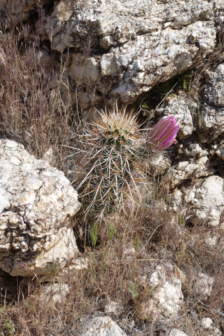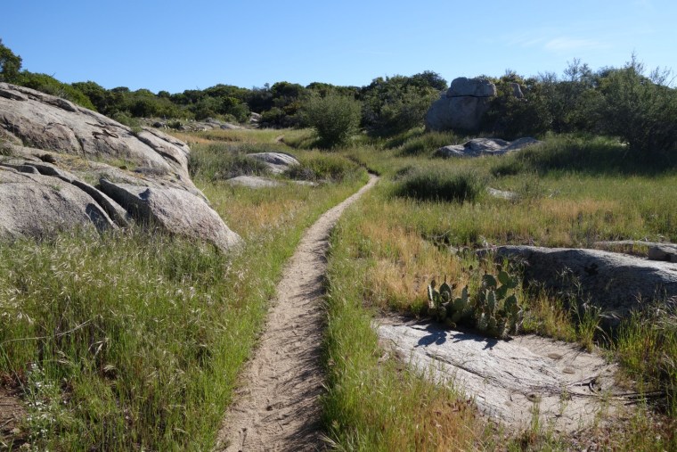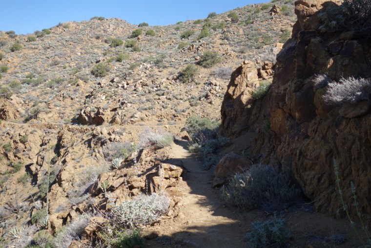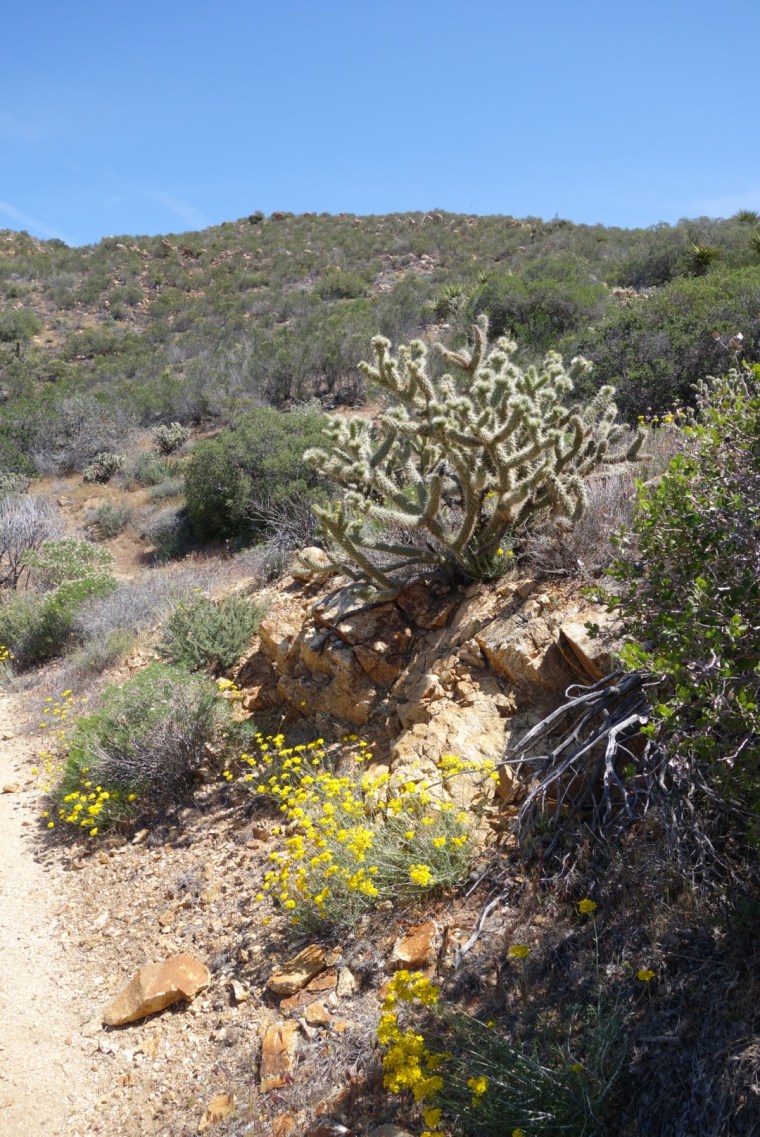 The trail quickly decends down a steep incline. The bushes thin, the grass gets dryer and cactuses hide around the rocks.