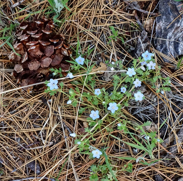 The terain shifts a third time. I find myself surrounded by pine trees. The ground is coated with pine needles and tiny electric blue flowers. It feels like a fairytale book forest! The air smells like vanilla and pine.