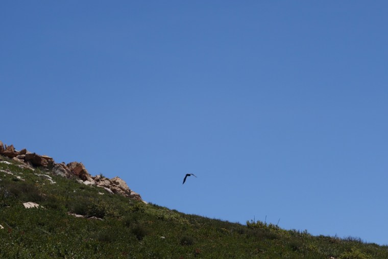 Come back shade! I don’t think I see another patch of shade for many miles. The sun is high and it’s hot. I’m already drinking all my water. I try to hike with my mouth closed to keep my mouth from getting dry. Just 10 more miles to the next water, I got this. I listen to music as I march up the switchbacks. The second I set up my umbrella the wind starts up. Fiddling with the umbrella slows me down. I see another hiker catching up in the distance. I wonder where everyone else is. I’m about to go around a ridge when I hear a very distinct rattling sound.