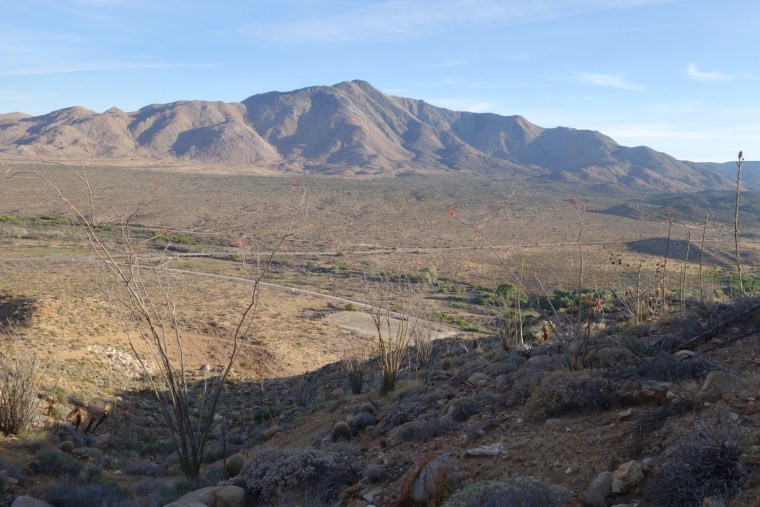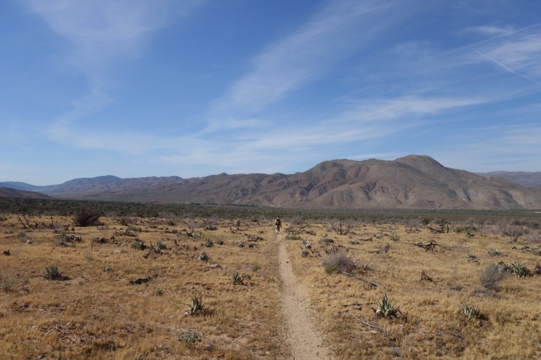 His bandana whips in the wind. I feel like I’m in the movie Laurence of Arabia. I catch up to him. What a tough man, he looks to be in his 70s. He plans on going into Julian for the night. We hike with each other through the wind and sand. It feels like forever.