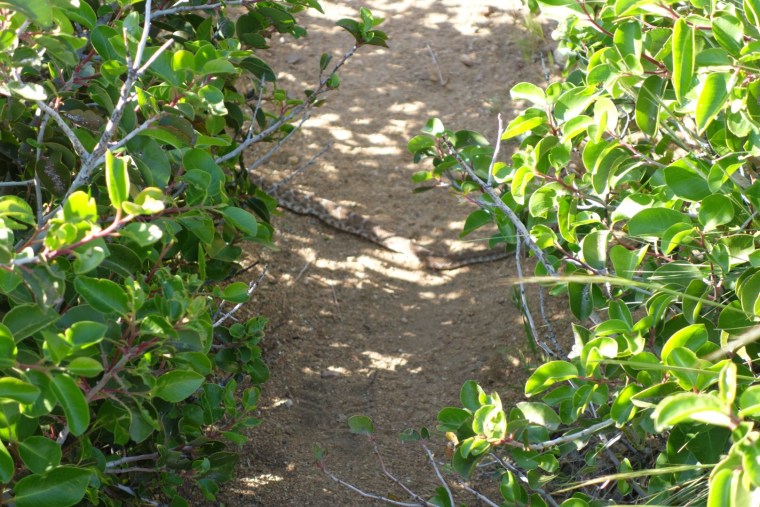 I find another rattlesnake lying across the trail. I don’t even bother trying to get it to move this time. I scramble around its resting spot.