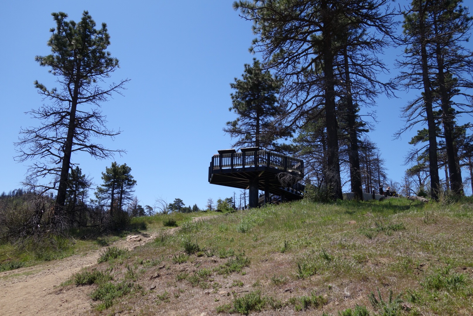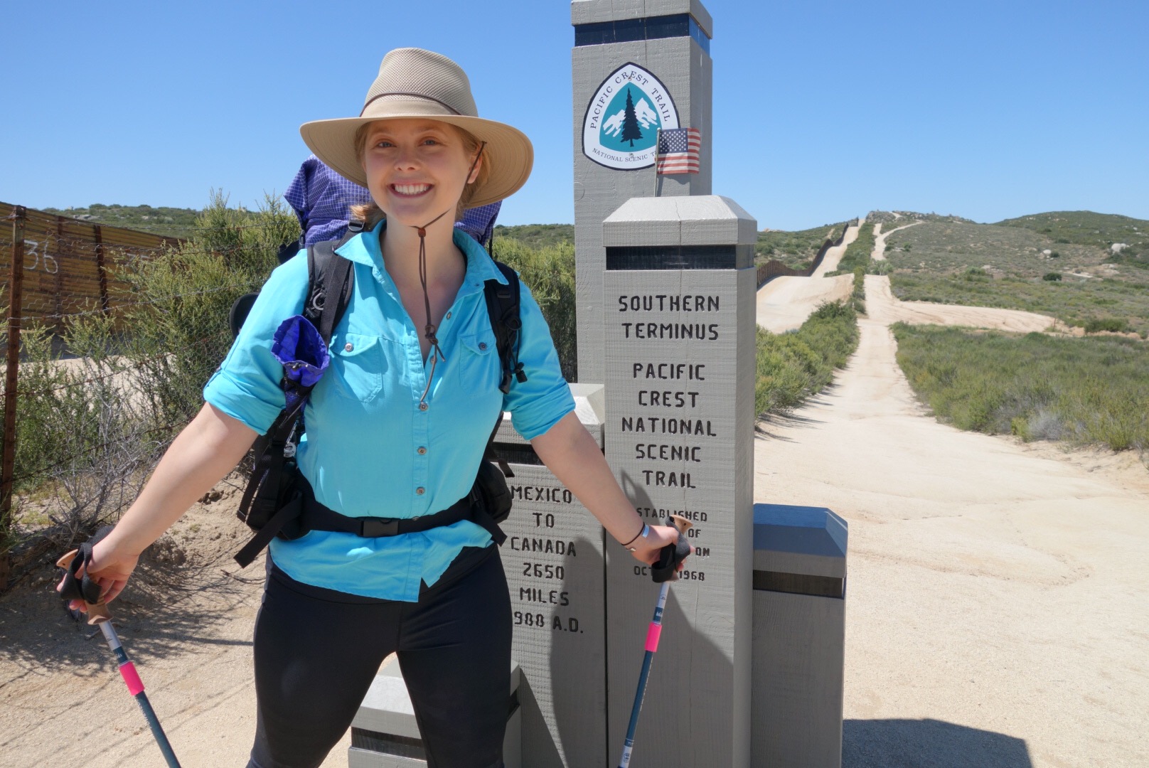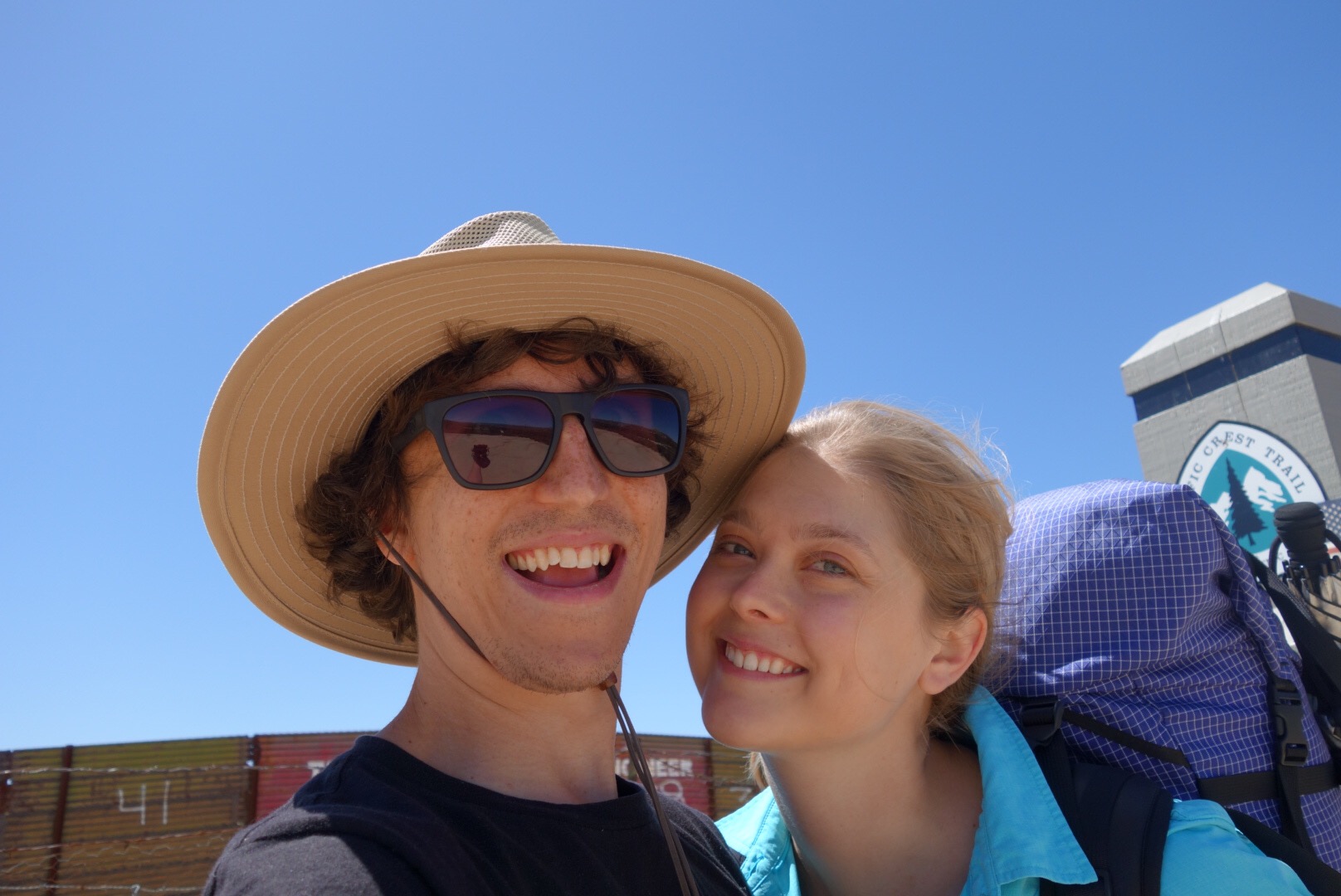 I can’t contain my excitement when I recognize the PCT trail markers crossing the road (I’m going to walk there, and there, and there) and then we arrive at the monument! A few cars are parked below it and my excitement turns into shyness.