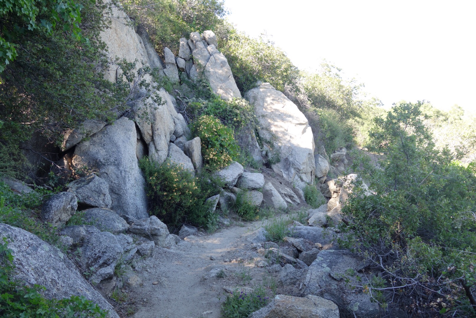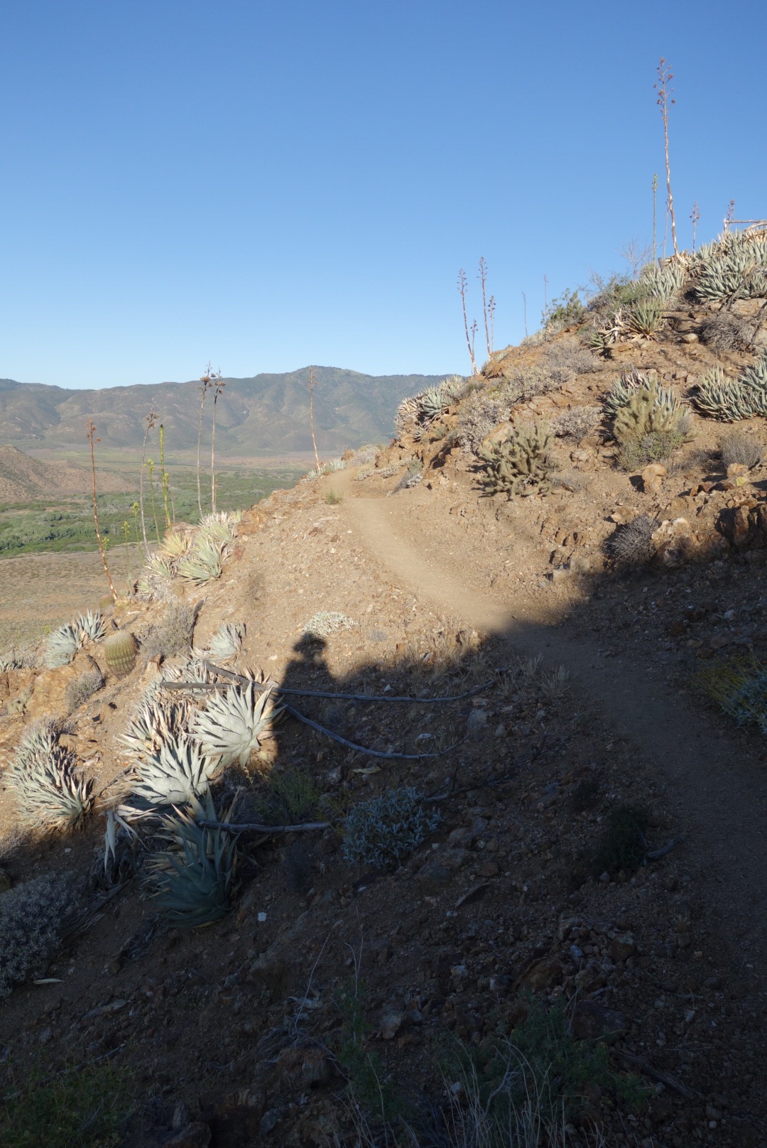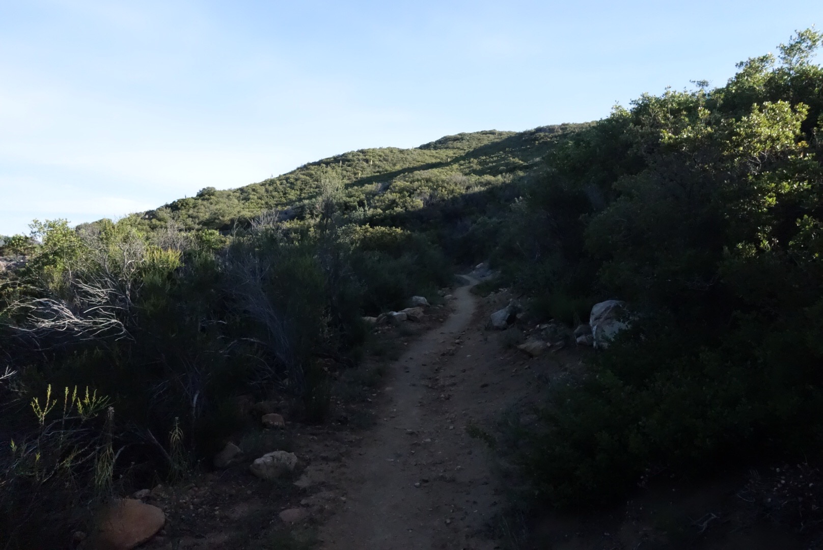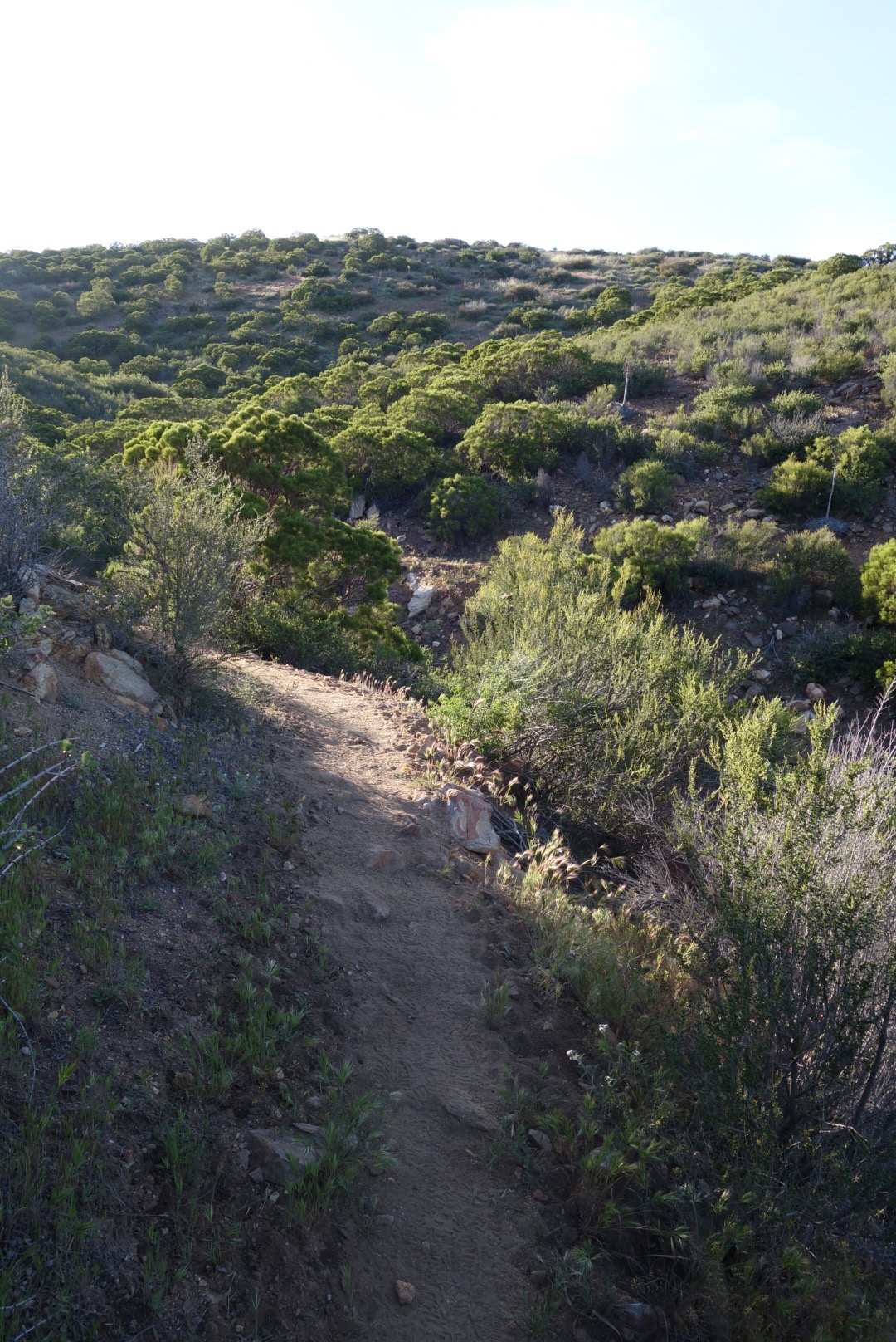 The trail quickly decends down a steep incline. The bushes thin, the grass gets dryer and cactuses hide around the rocks.