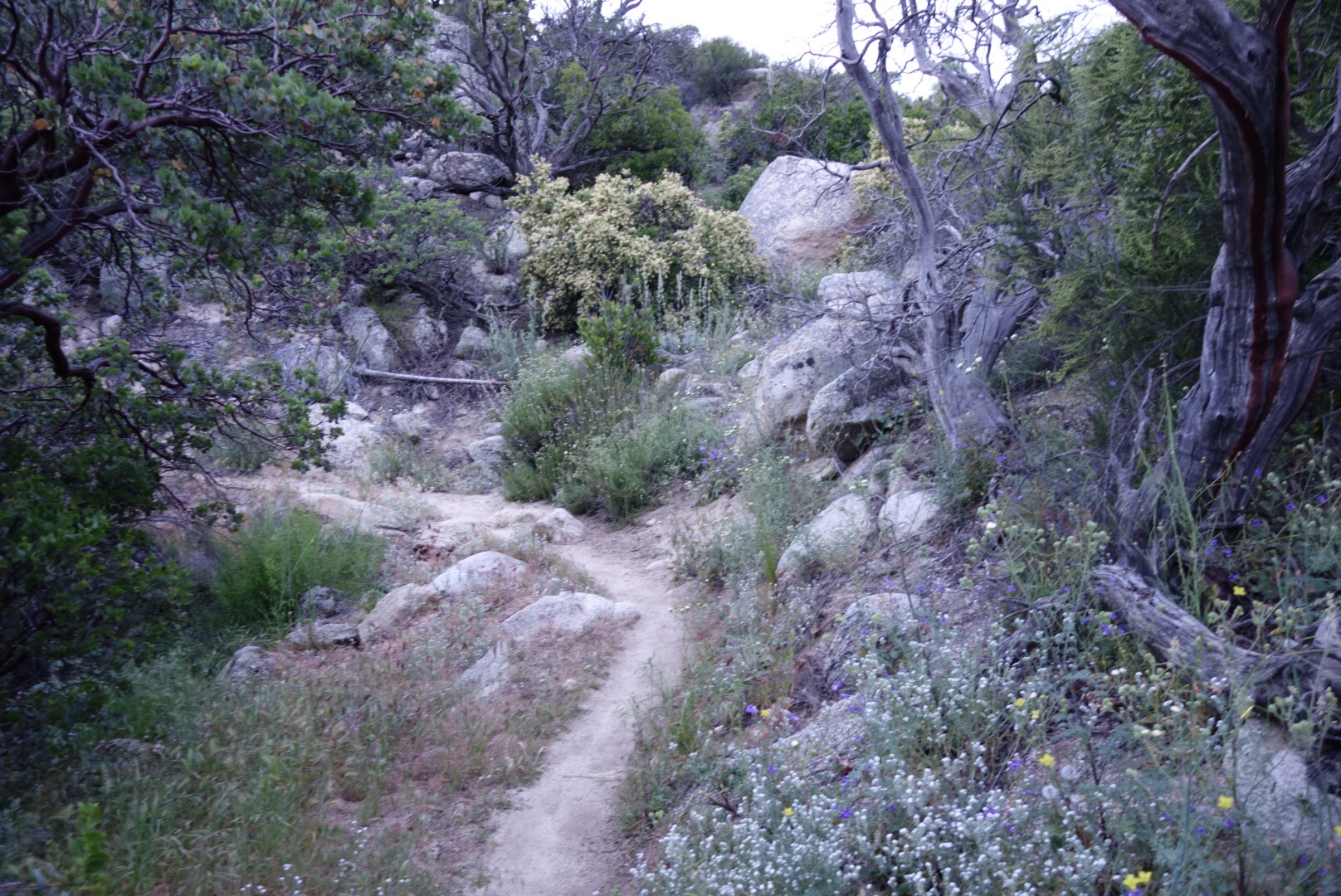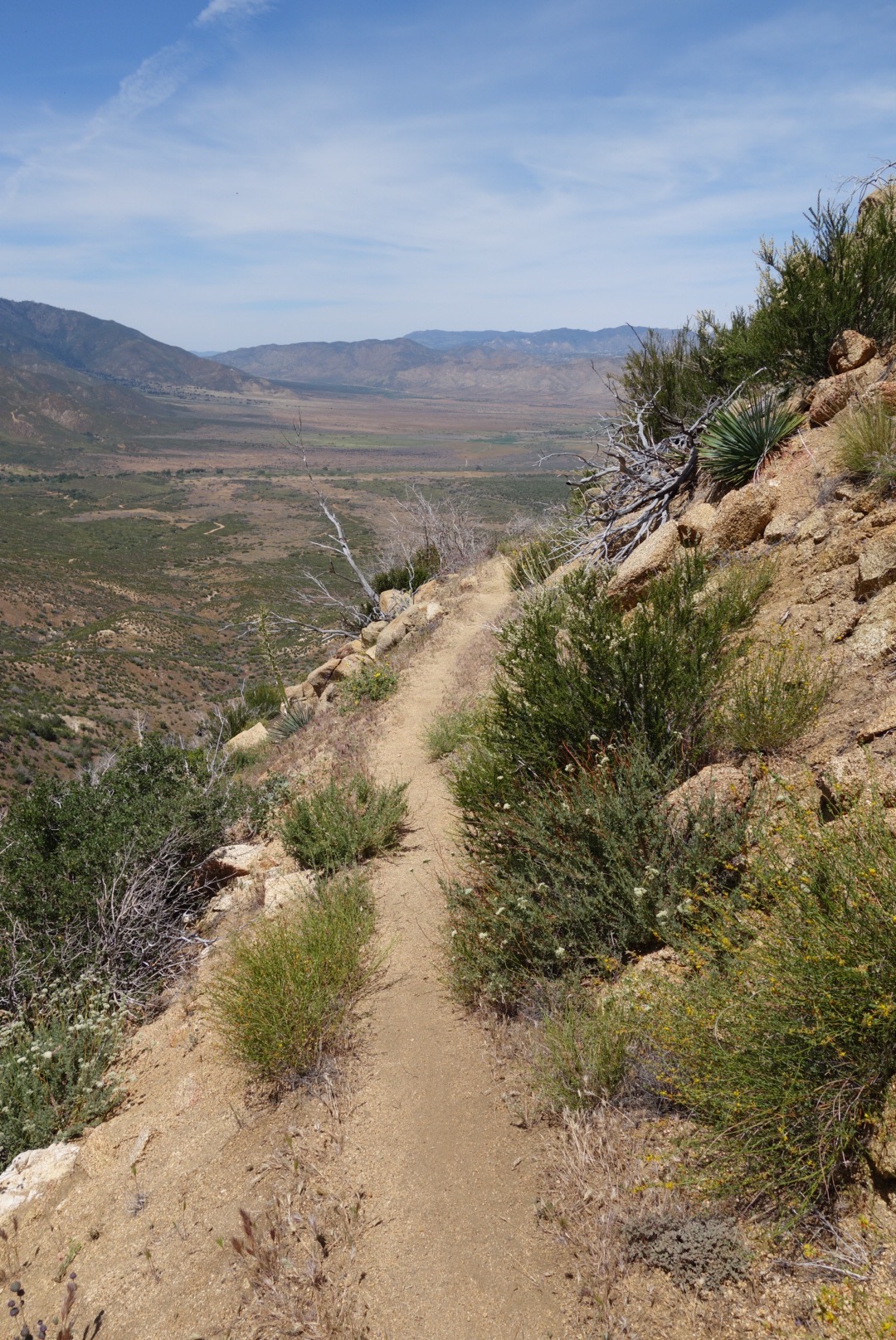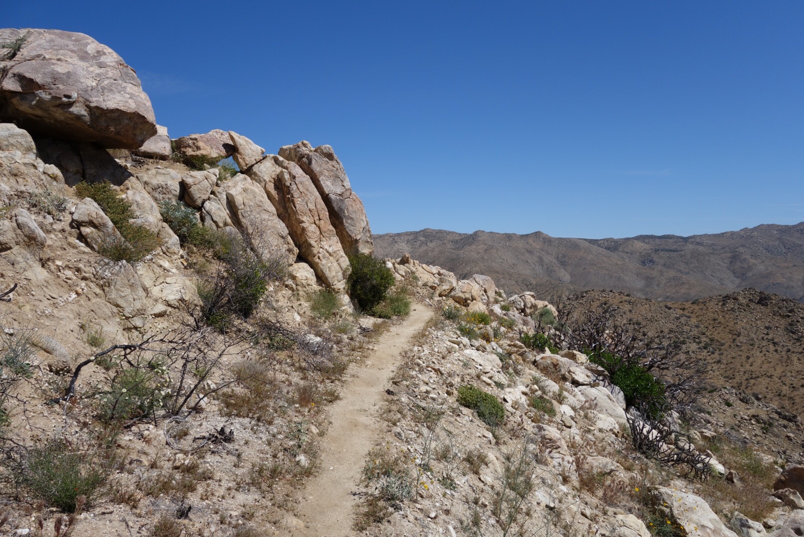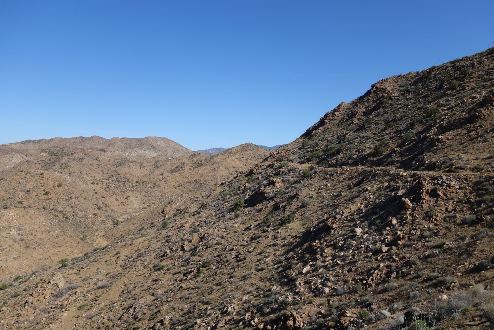 The trail quickly decends down a steep incline. The bushes thin, the grass gets dryer and cactuses hide around the rocks.