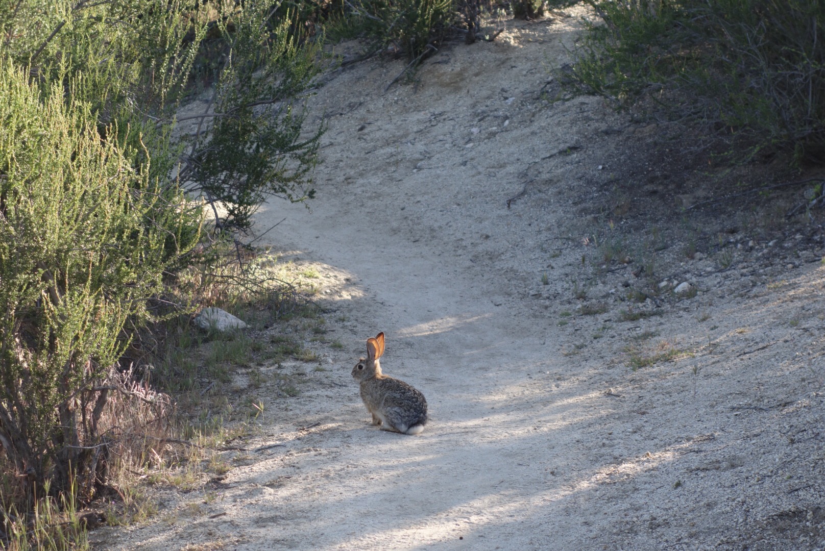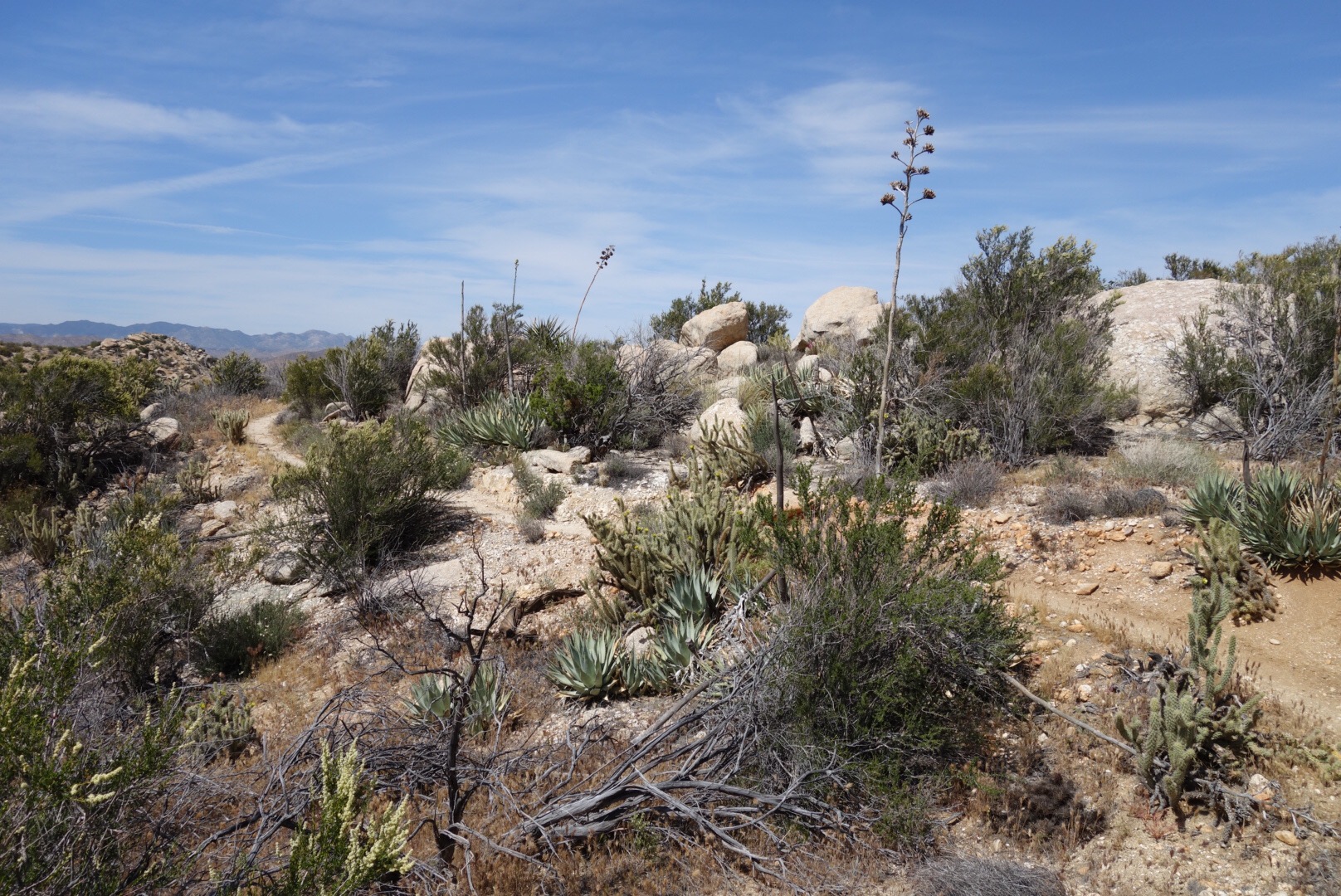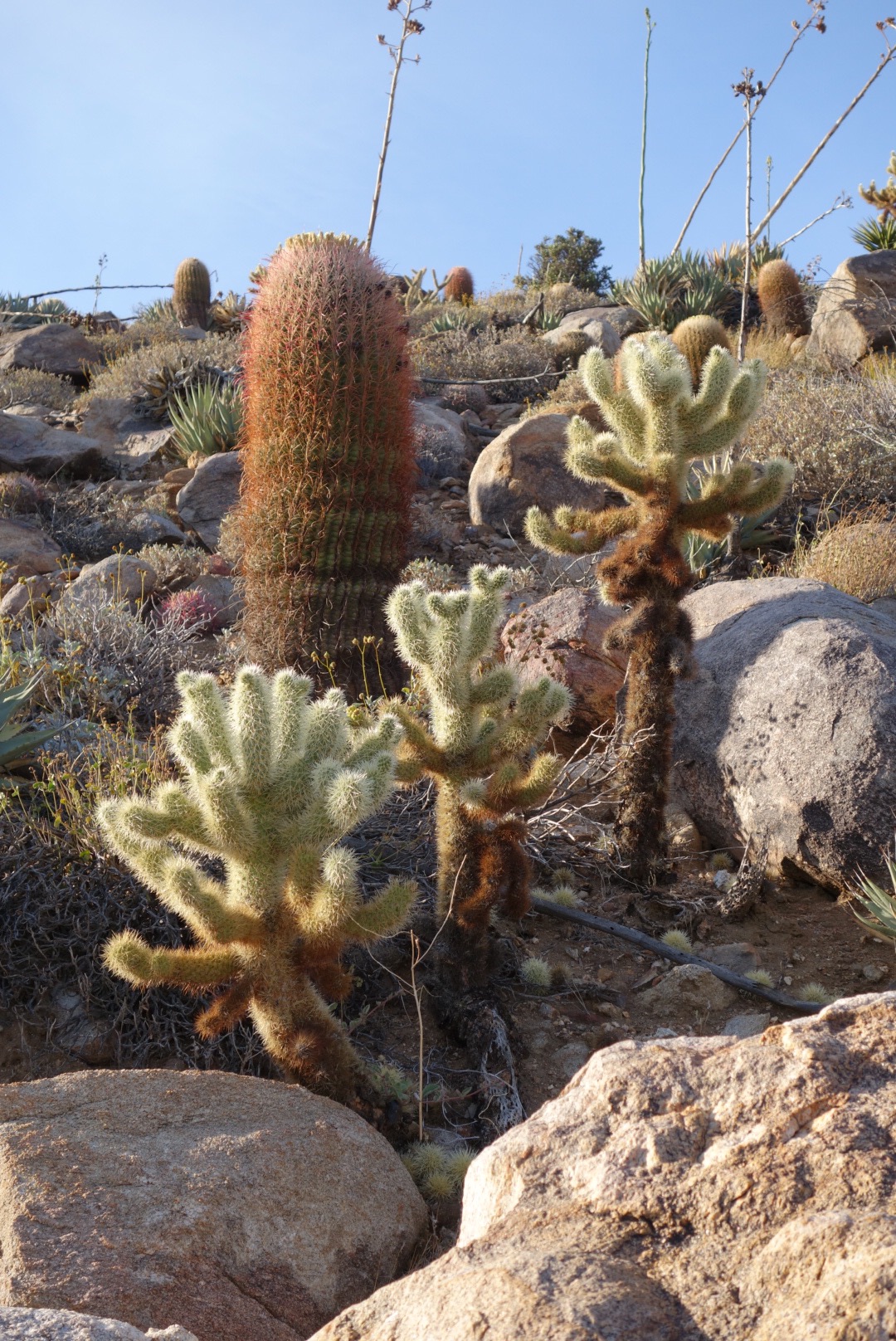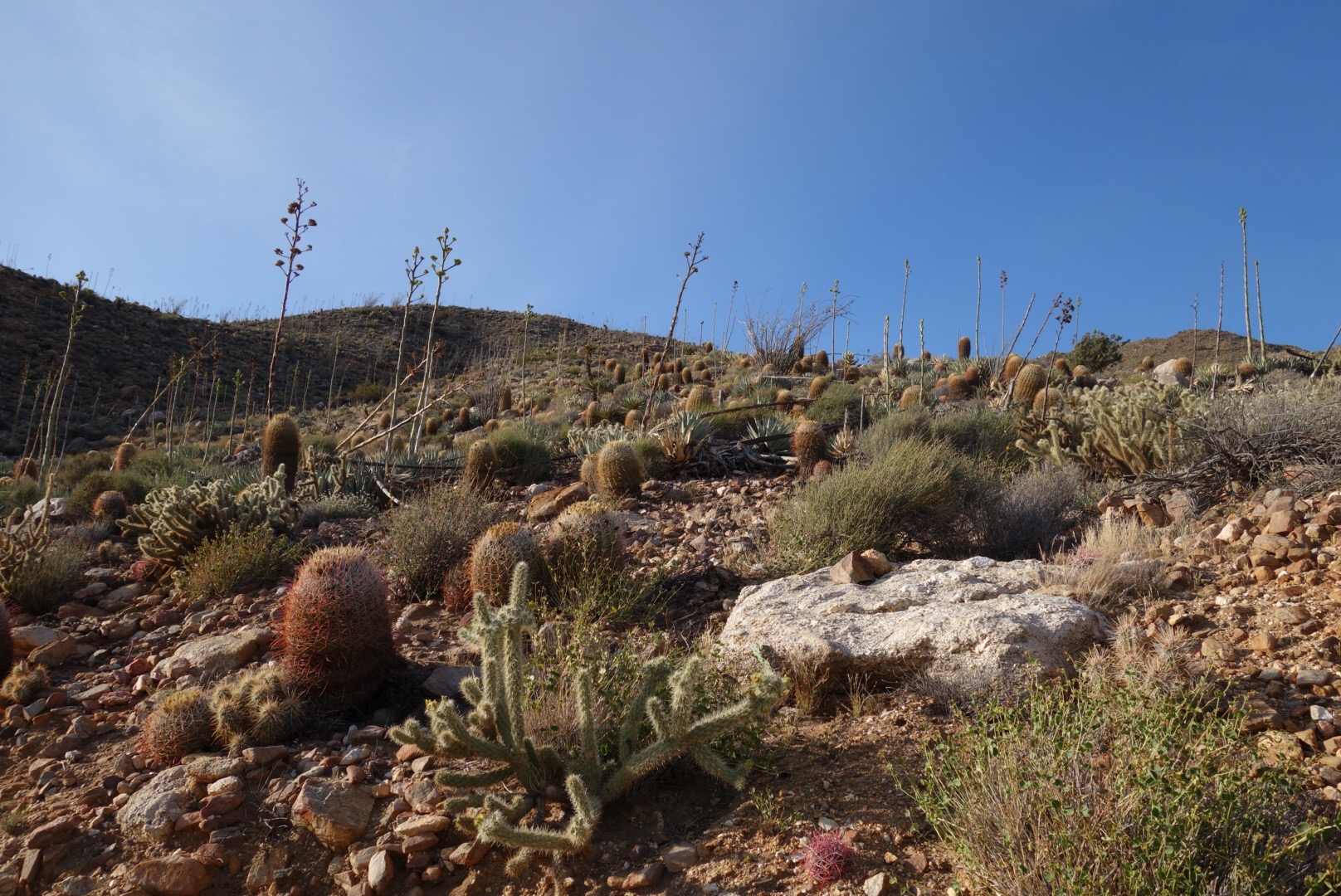 The trail quickly decends down a steep incline. The bushes thin, the grass gets dryer and cactuses hide around the rocks.