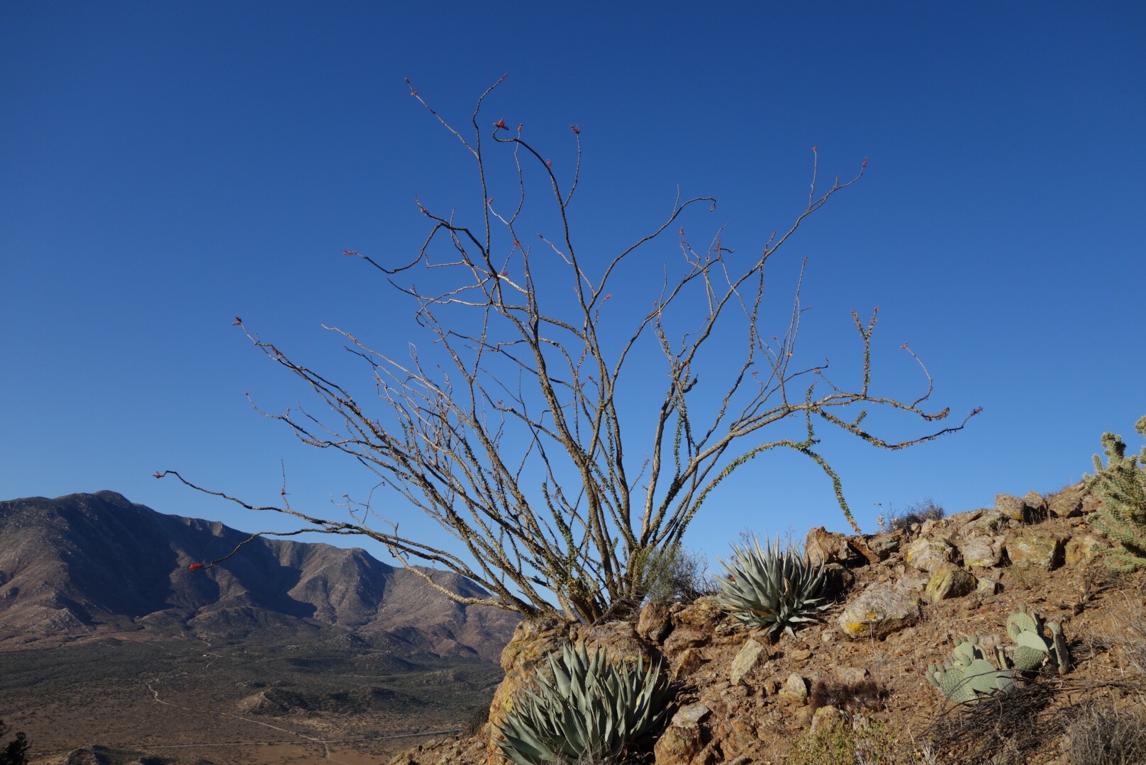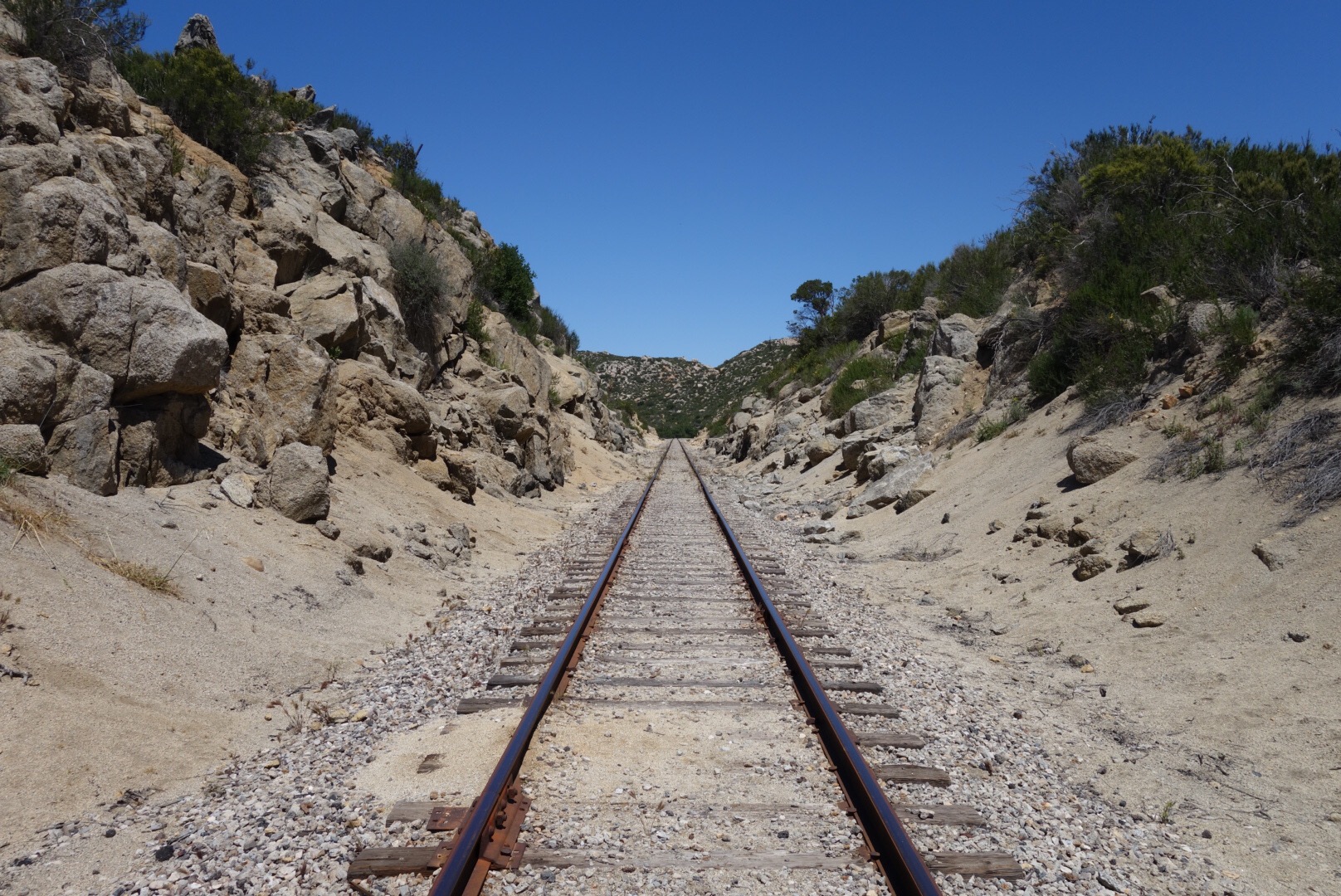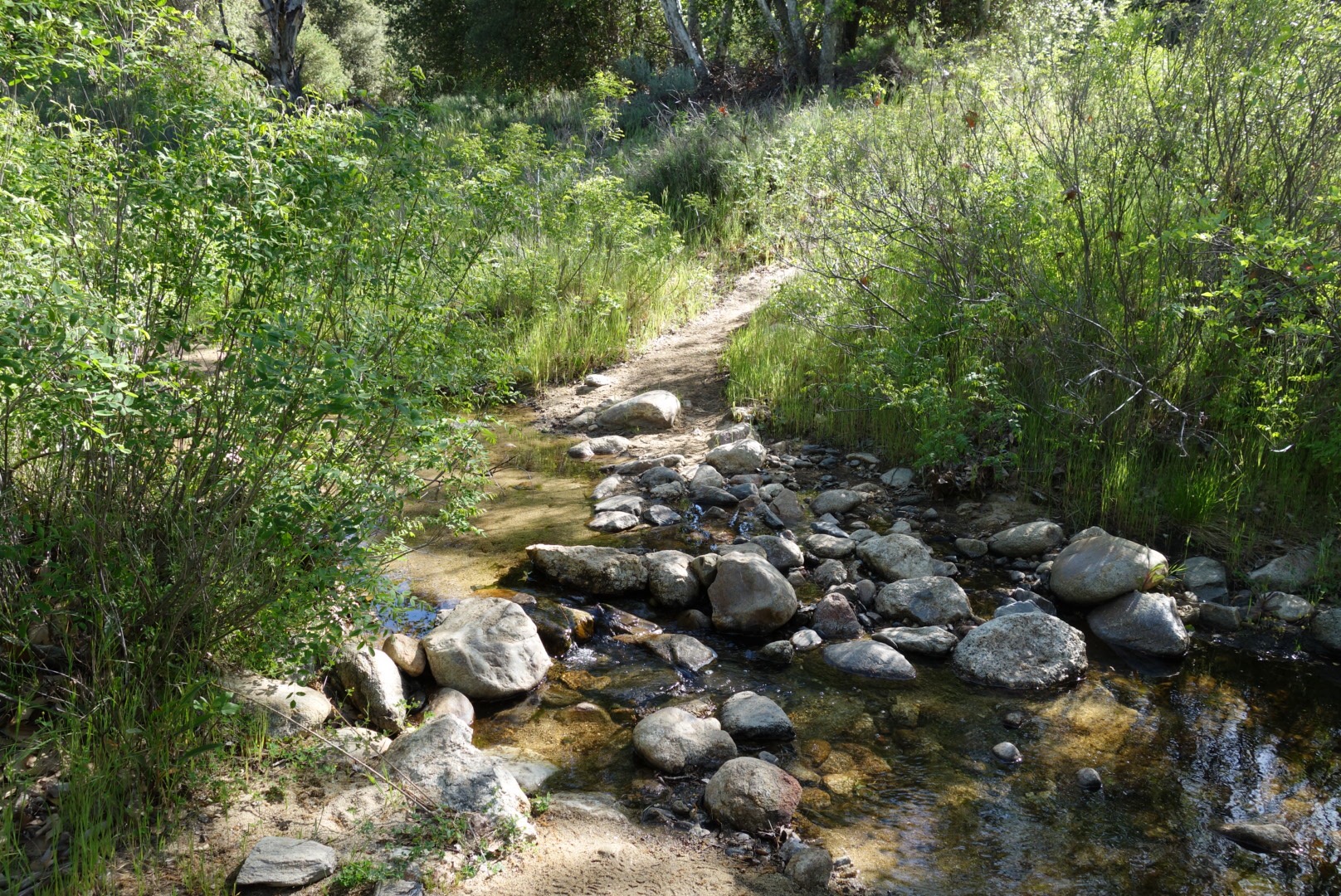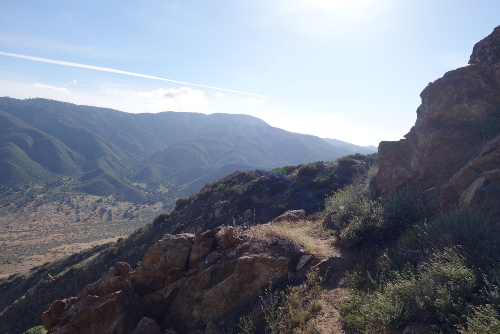 The trail quickly decends down a steep incline. The bushes thin, the grass gets dryer and cactuses hide around the rocks.