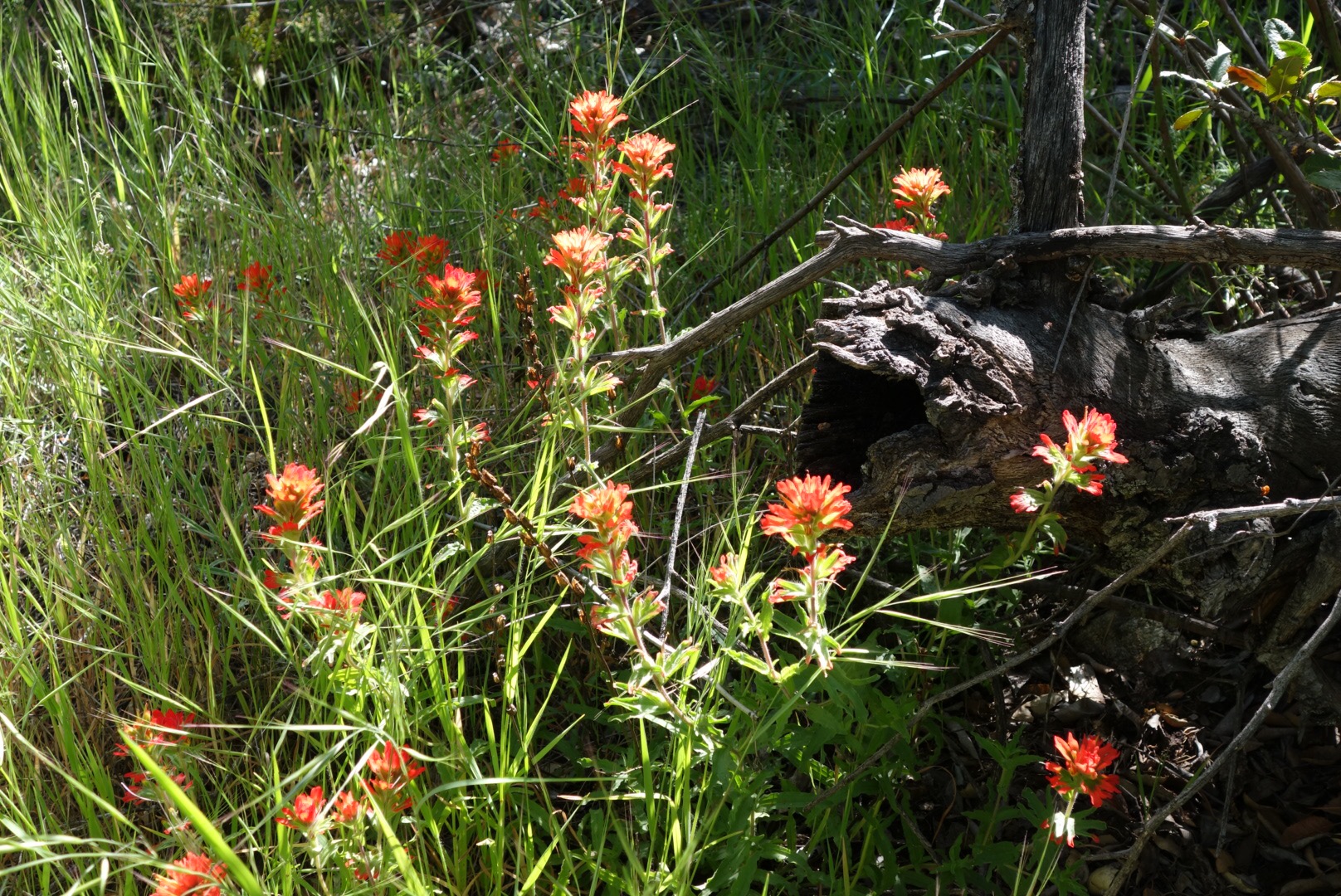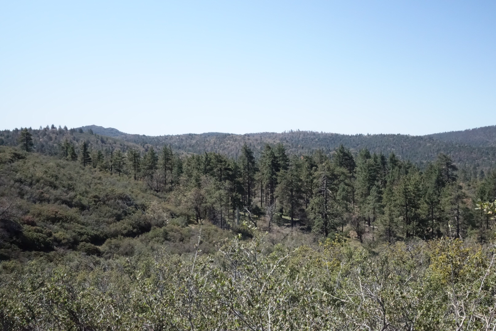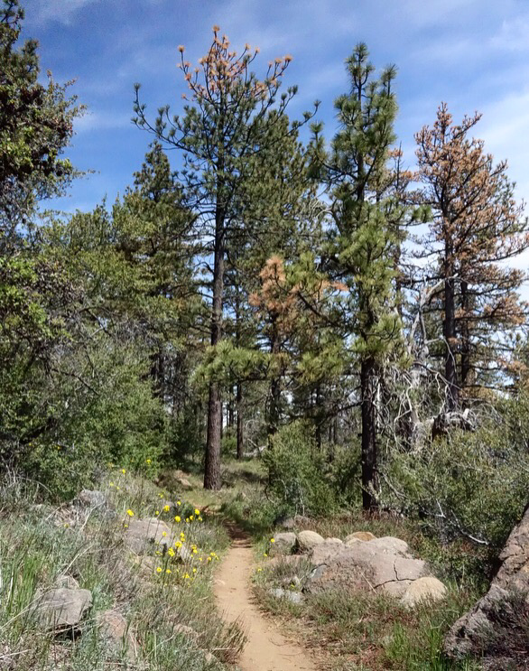 It’s a beautiful morning. The climb out of the campground is cast in cool shade. Lucky me! I bet this area will get hot later. I watch as the shadows get shorter and shorter as the sun climbs the sky and I crest the ridge. Birds call out from the trees and swoop over the trail. Their playful shadows pass over me like tiny fighter planes.