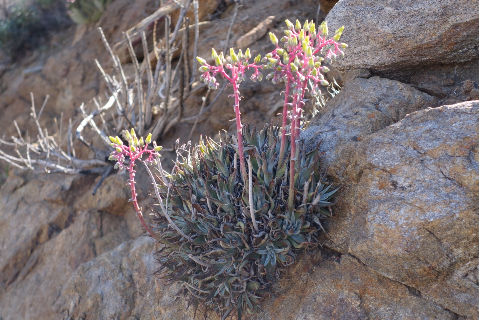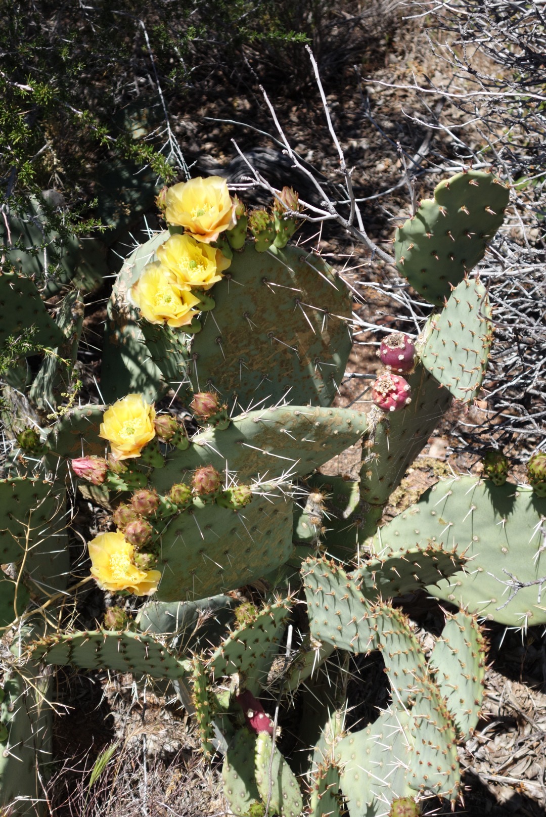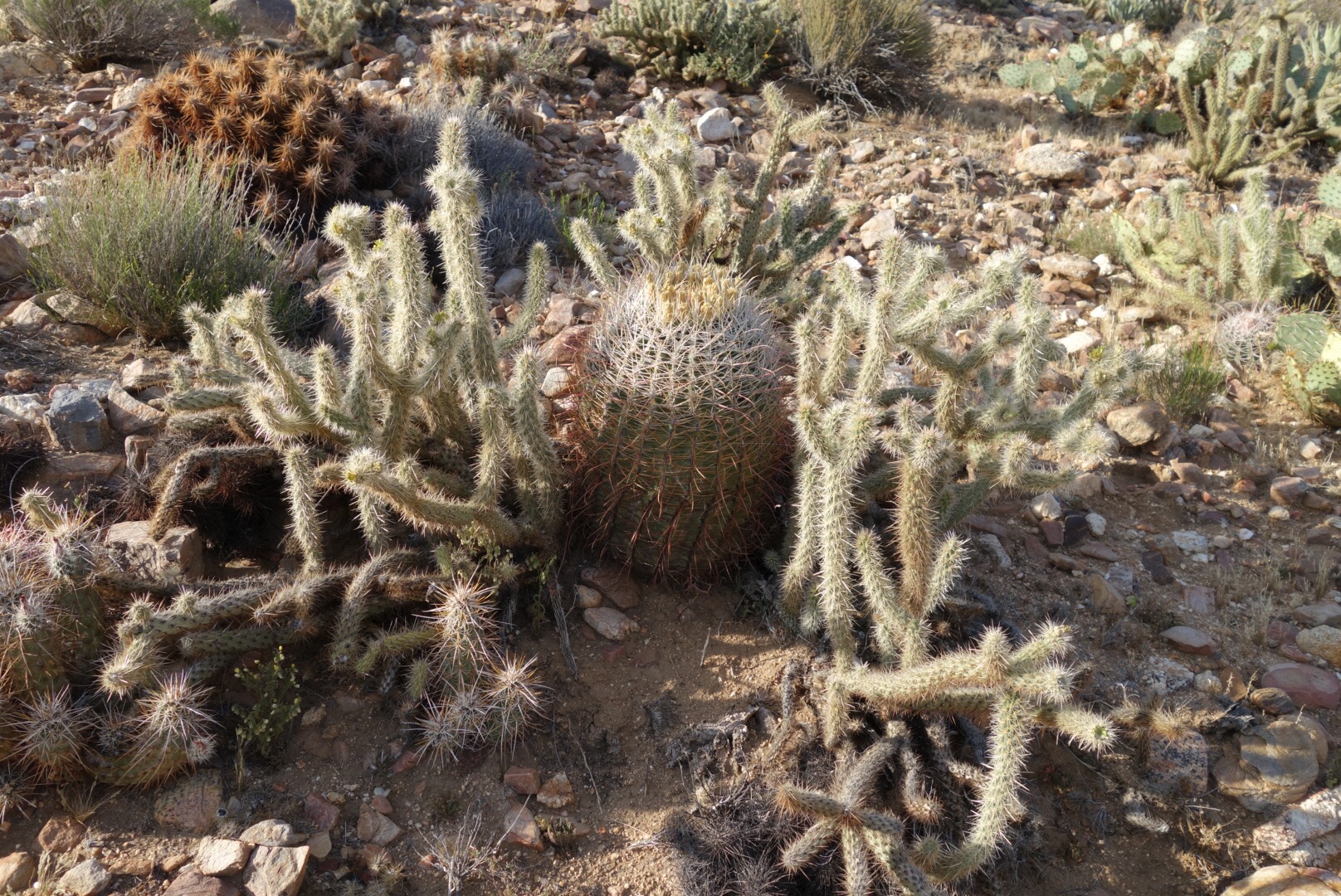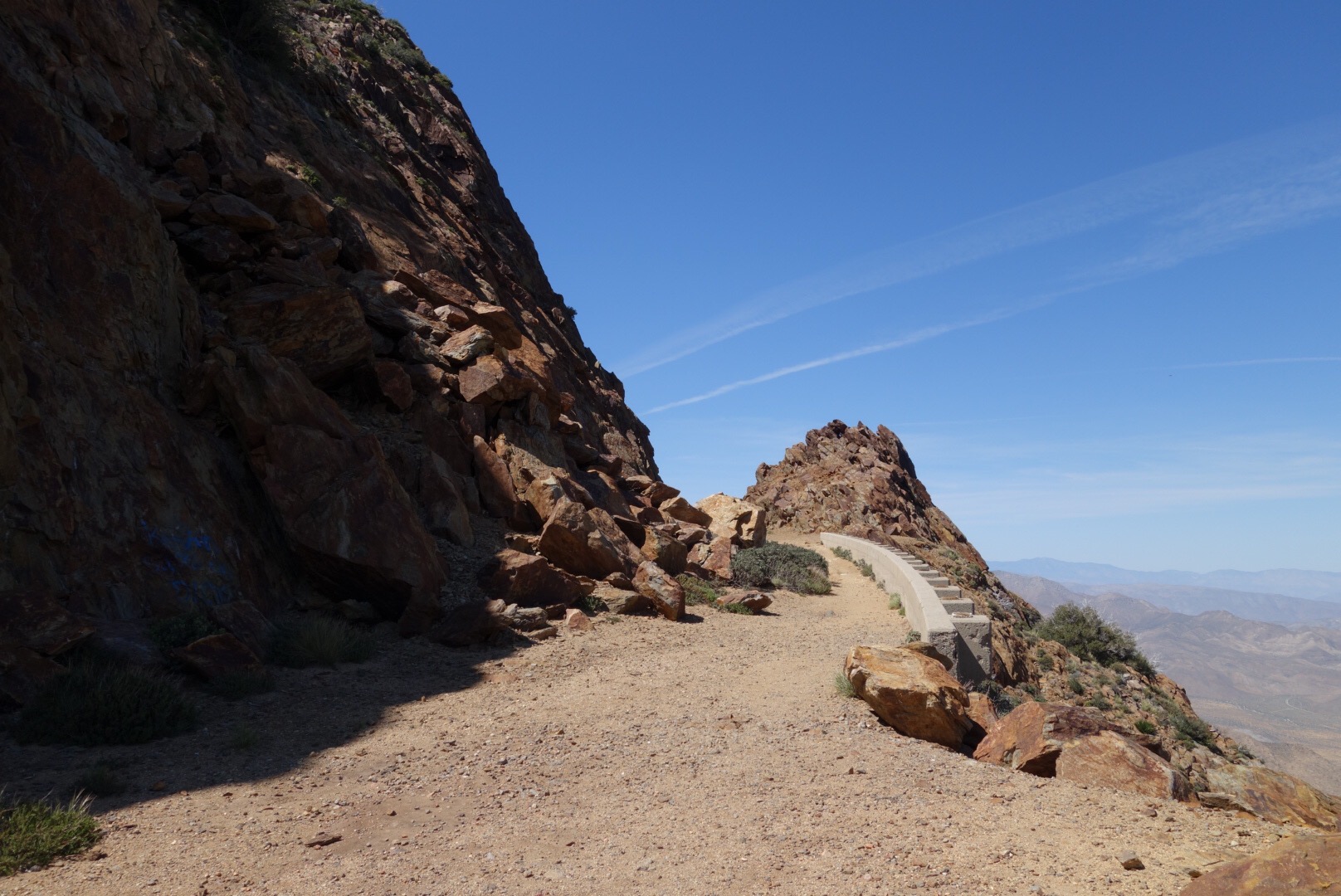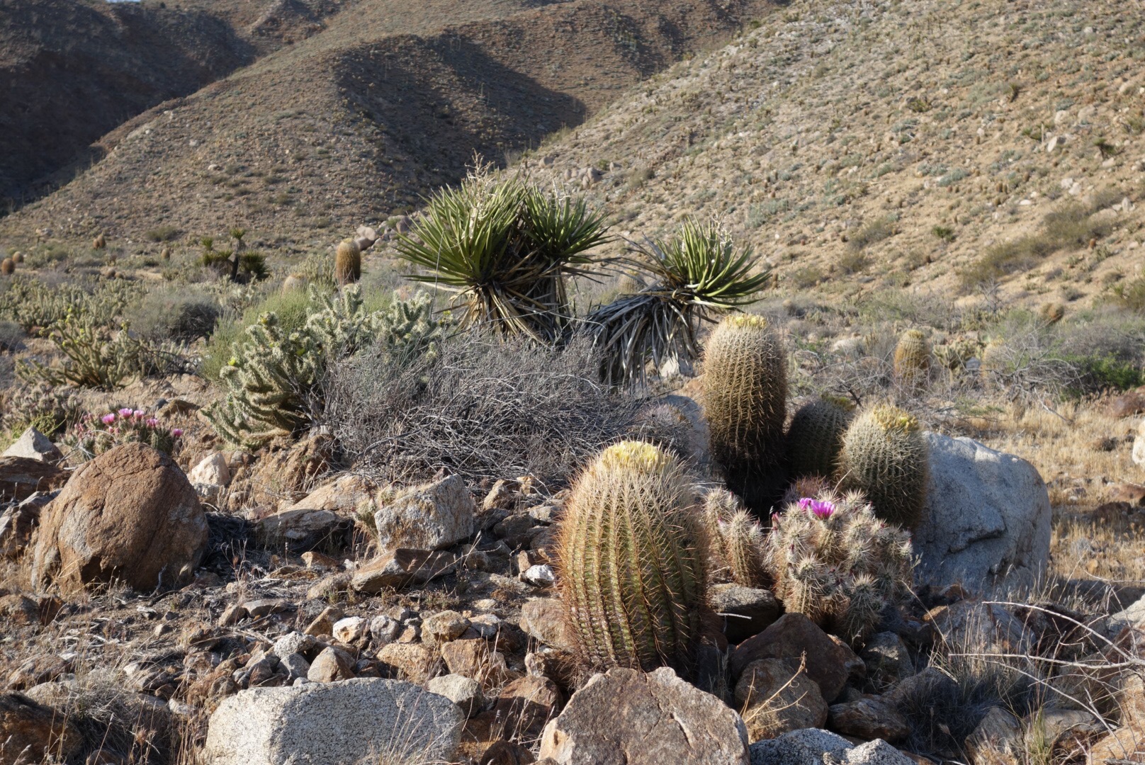 I pass a few couples hunkered down in what little shade there is. The trail winds around and around. So many switch backs! Eventually it takes me even lower. I start to see a few really tough cactuses.