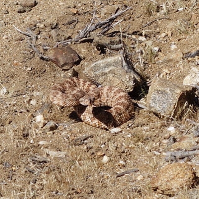 Come back shade! I don’t think I see another patch of shade for many miles. The sun is high and it’s hot. I’m already drinking all my water. I try to hike with my mouth closed to keep my mouth from getting dry. Just 10 more miles to the next water, I got this. I listen to music as I march up the switchbacks. The second I set up my umbrella the wind starts up. Fiddling with the umbrella slows me down. I see another hiker catching up in the distance. I wonder where everyone else is. I’m about to go around a ridge when I hear a very distinct rattling sound.