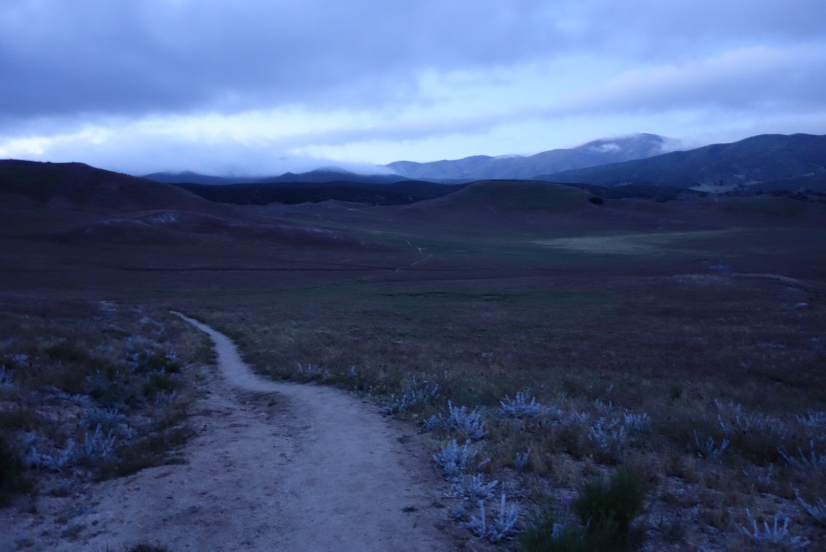I check the time, it’s 2am. Great. Now what. I could look for a different spot to set up my tent. The clouds part and the moon illuminates the trail. It’s beautiful. Everything has a crystallized dewy look in the light of my headlamp. Mist floats across the trail and into the trees. The air smells like wet sage.