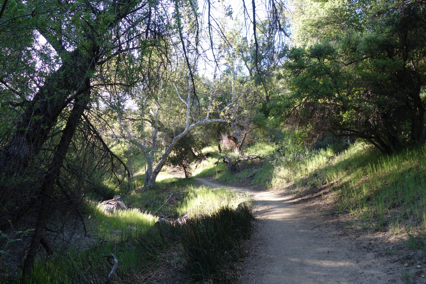 The trail then leads me down into a valley with tall trees and waving grass. The air smells like old wood and earth. A stream bables to the left. I can hear it but I can’t see it, it’s covered with so many plants.