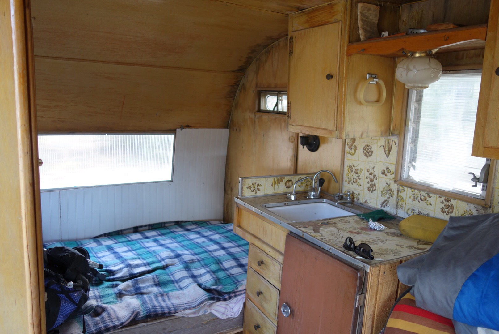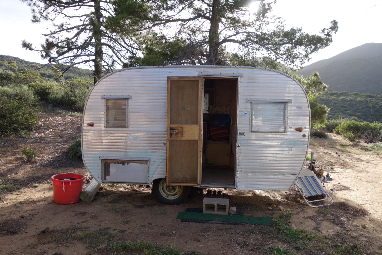 I nod my head. He points to a tiny trailer.